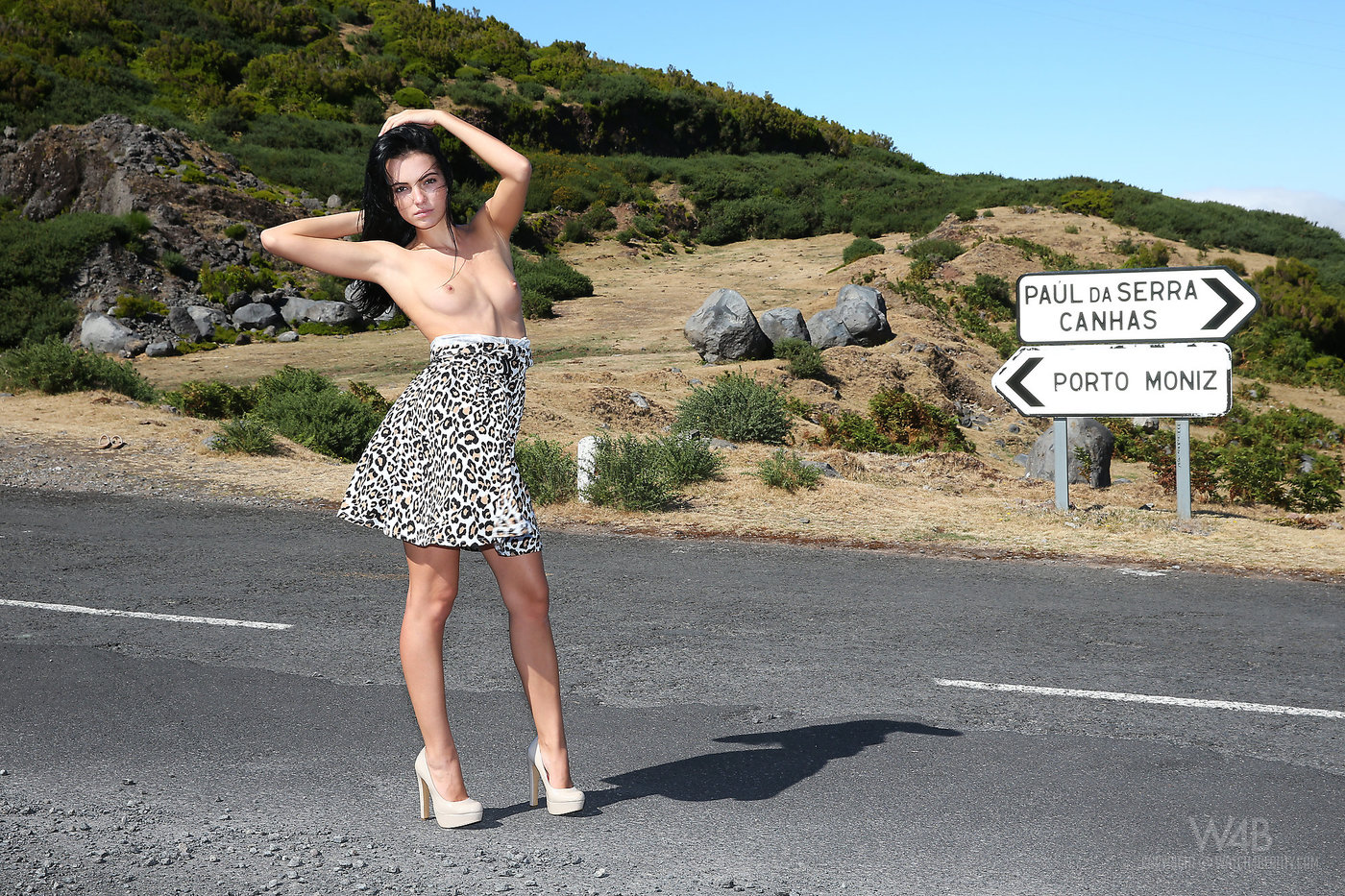Dress-wearing brunette chick slowly undressing next to a road sign