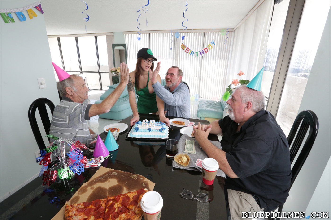 Glasses-wearing half-naked teen servicing a bunch of old fucks