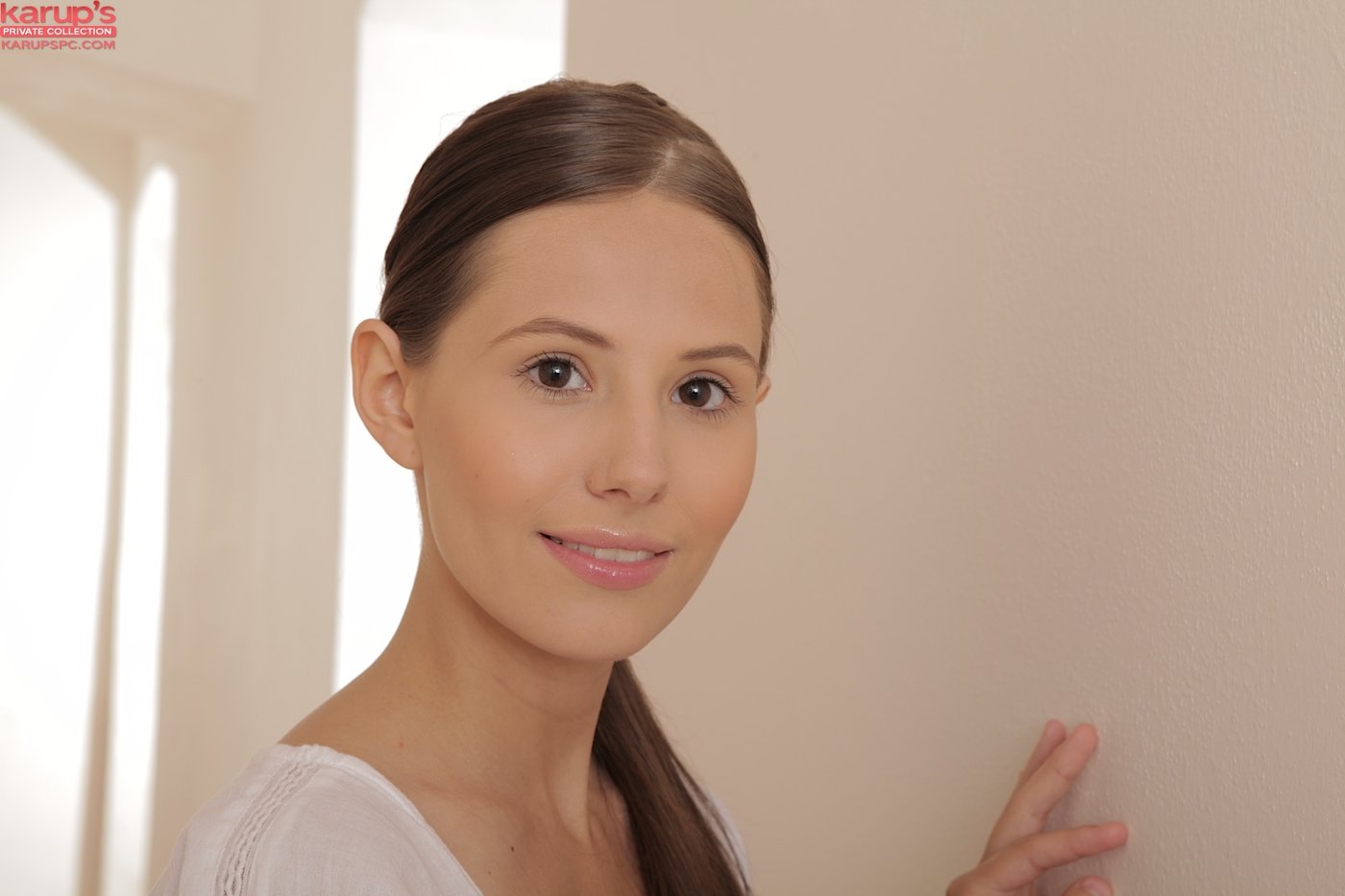 Ponytailed brunette dressed in all white shows her crotchless pantyhose